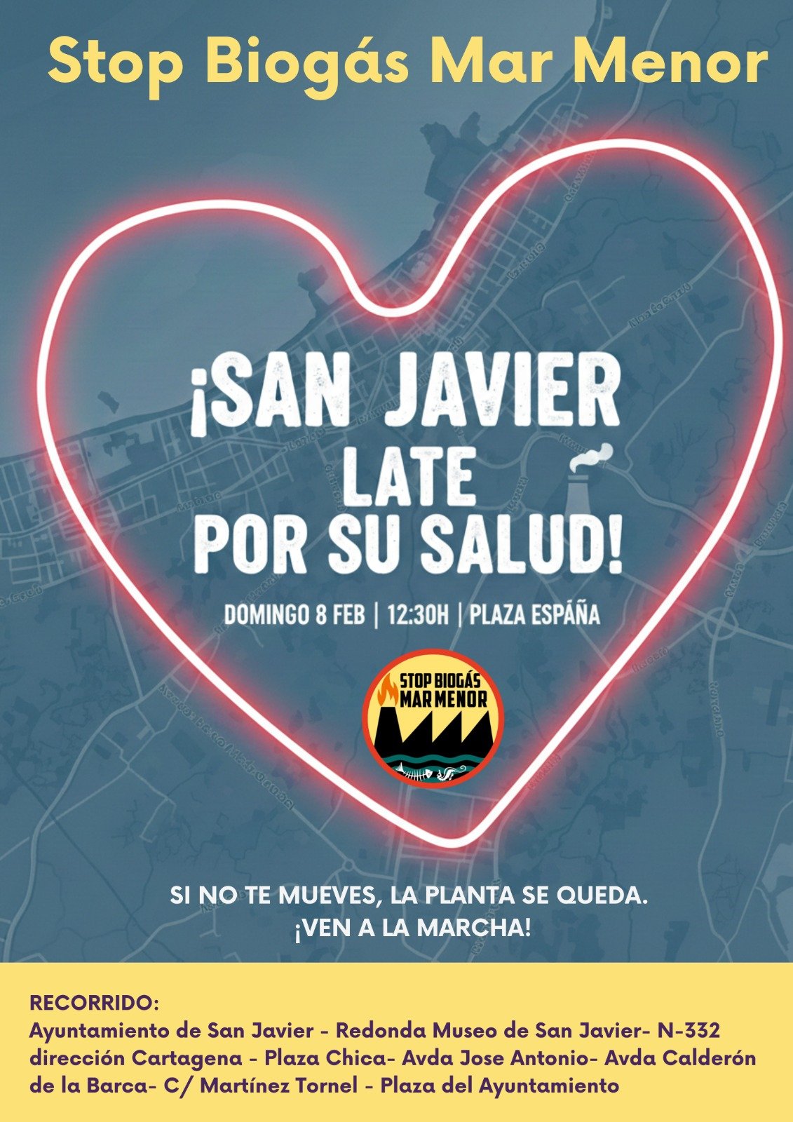 Plataforma STOP BIOGÁS Los Camachos - Cartagena - Mar Menor ¡DEFENDEMOS NUESTRA SALUD, NUESTRO ENTORNO Y NUESTRO FUTURO! La macroplanta de biogás amenaza nuestra salud, nuestra calidad de vida y el futuro del Mar Menor. No permitiremos que contaminen nuestra tierra ni nuestro aire. Jueves 12 de Febrero 09:30 AM Plaza del Ayuntamiento ¡VEN Y...